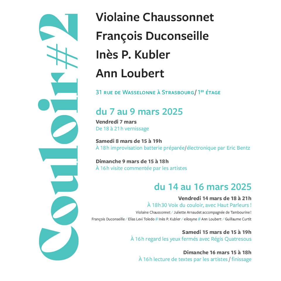 Poème écrit dans le cadre de Couloirs II chez Ann Loubert à Strasbourg, mars 2025. Inspiré des œuvres d’Inès Kubler.